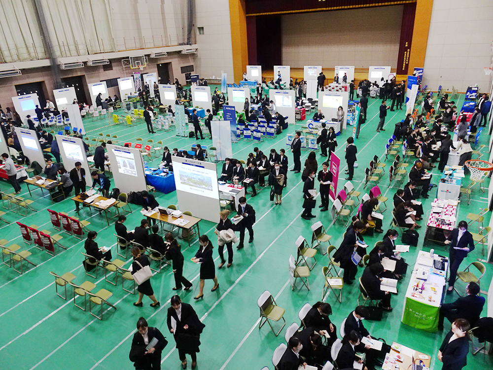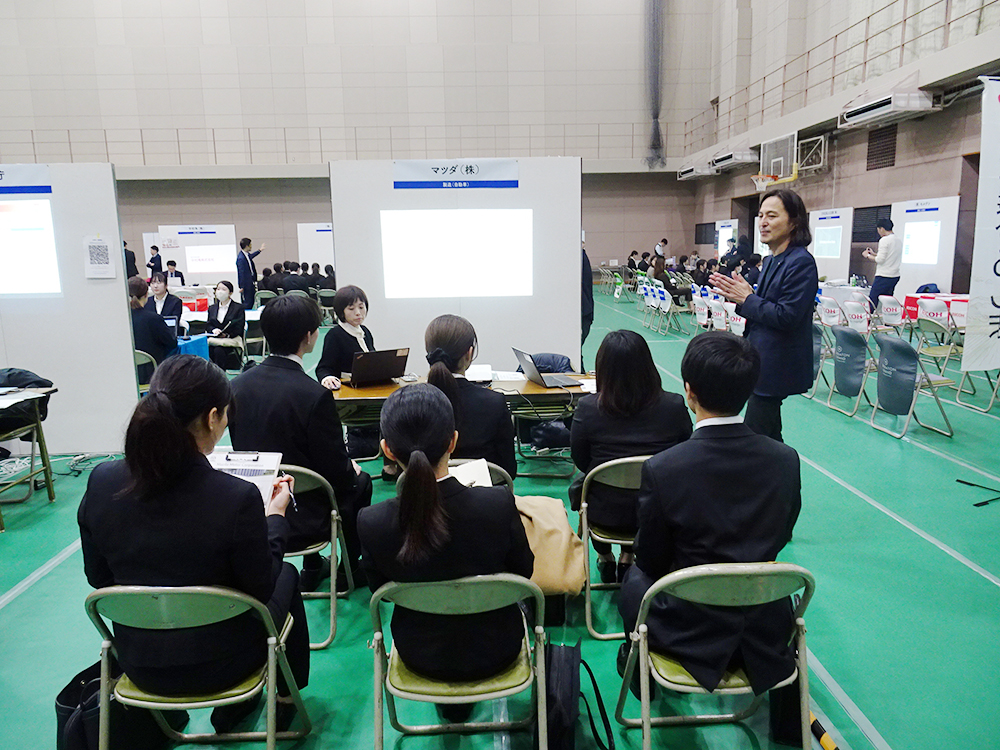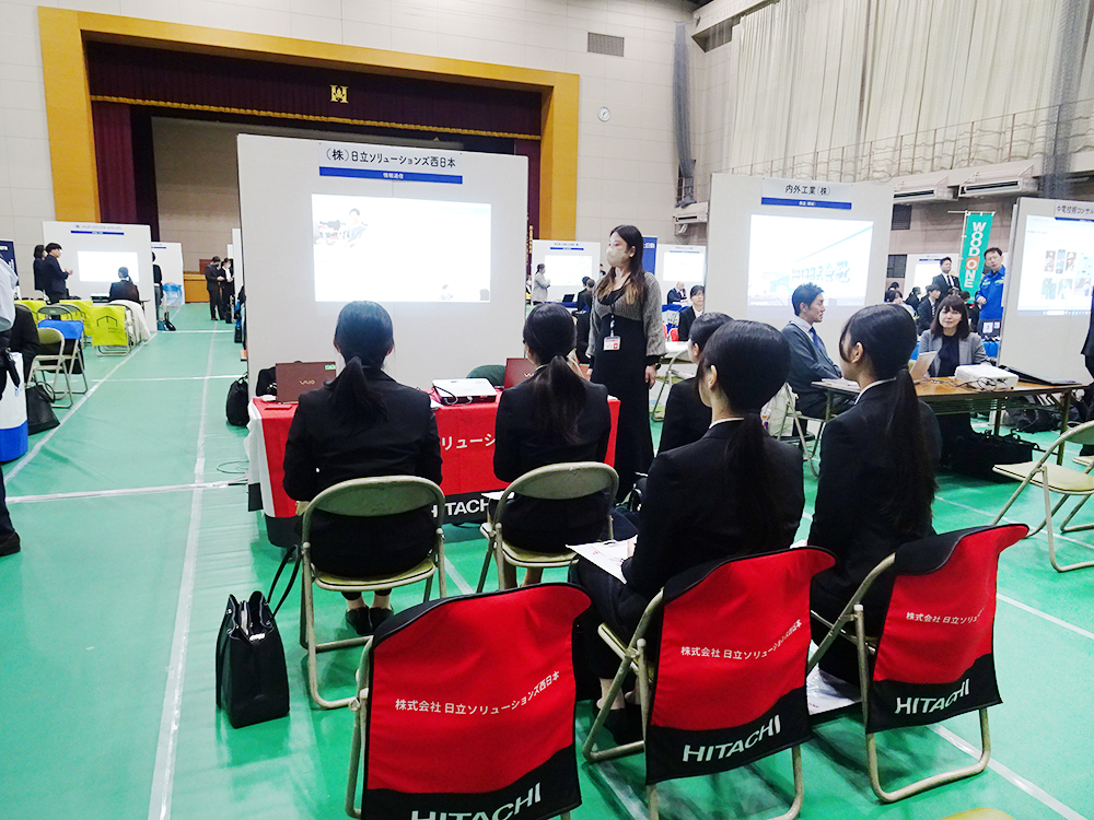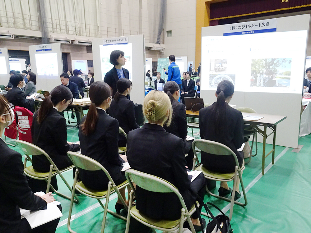 当イベントには、広島キャンパスだけでなく庄原キャンパス・三原キャンパス・叡啓大学から学部3年生を中心に総勢約180名の学生が参加しました。学生は熱心に複数の企業ブースを回り、会社概要や業務内容、各種制度などのお話を聴かせていただくとともに、企業のみなさまには学生からの様々な質問にも丁寧にお答えいただきました。