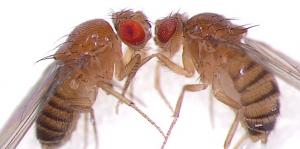 図4. ショウジョウバエの写真。左は野生型の個体、右はがん個体(眼にがんが誘導されています)。