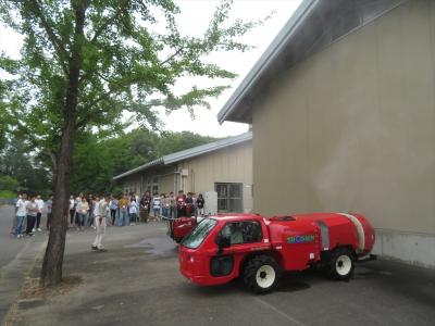 奥教授による病害虫防除の講義です。いろいろなスライドが印象に残ります。その後は農薬の安全使用のための防除の実際についてスタッフさんから指導を受けました。新型のスピードスプレーヤーも見てもらいました。