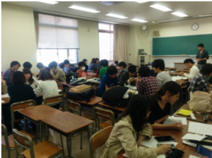本学では地域連携センターが開発した,ひろしまクラウドキャンパスシステムを用いて,授業の動画やデジタル化した資料を独自のクラウドシステムで学生に提供しました。学生はシャープ株式会社から貸与されたタブレット端末を用いて,大学でも自宅でも動画と資料を見ながら学んでいました。大学での講義においては,複数の班に分かれてワークショップ形式で議論をし,問題を明確にすると共に,自ら解答を提案します。教員とティーチングアシスタントの院生が議論のヒントを出しながら正解を自ら導き出す授業が行われました。