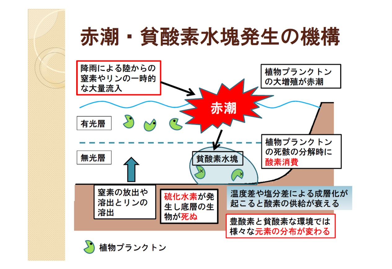 閉鎖性海域とは,周囲を陸地に囲まれた内湾や内海のことです。完全に閉じているわけではなく,周りの海とつながっており,外との水の交換が行われにくい海域を指します。古くから良い漁場として利用されていますが,水の交換が行われにくいため,汚染物質が蓄積しやすい場所と言えます。しかしながら汚染物質が流されなくても、環境が良い状態とは言えない閉鎖性海域があります。その閉鎖性海域を調べて環境を守るお手伝いをするのがこの研究室のテーマです。 環境悪化の原因の一つが海水中あるいは底質中で酸素が少なくなることです。酸素が少なくなる原因としては,酸素を消費しやすい物質が多量に存在する,あるいは海面からの酸素供給能力が衰える,が挙げられます。その主な関係を図に示しました。当研究室では,様々な元素の分布を調べて,そのデータを利用して何が起こっているのか(どこで環境悪化が起こっているか)を明らかにしようとしています。(続きを読む) |
